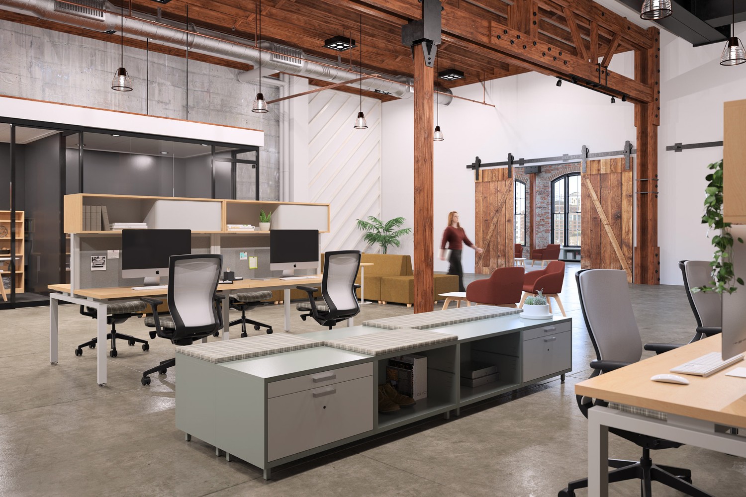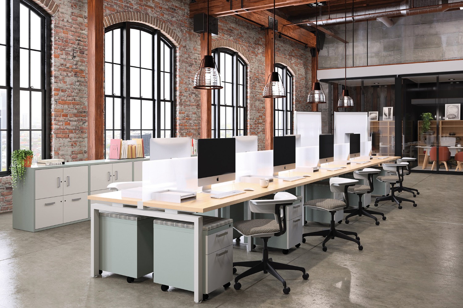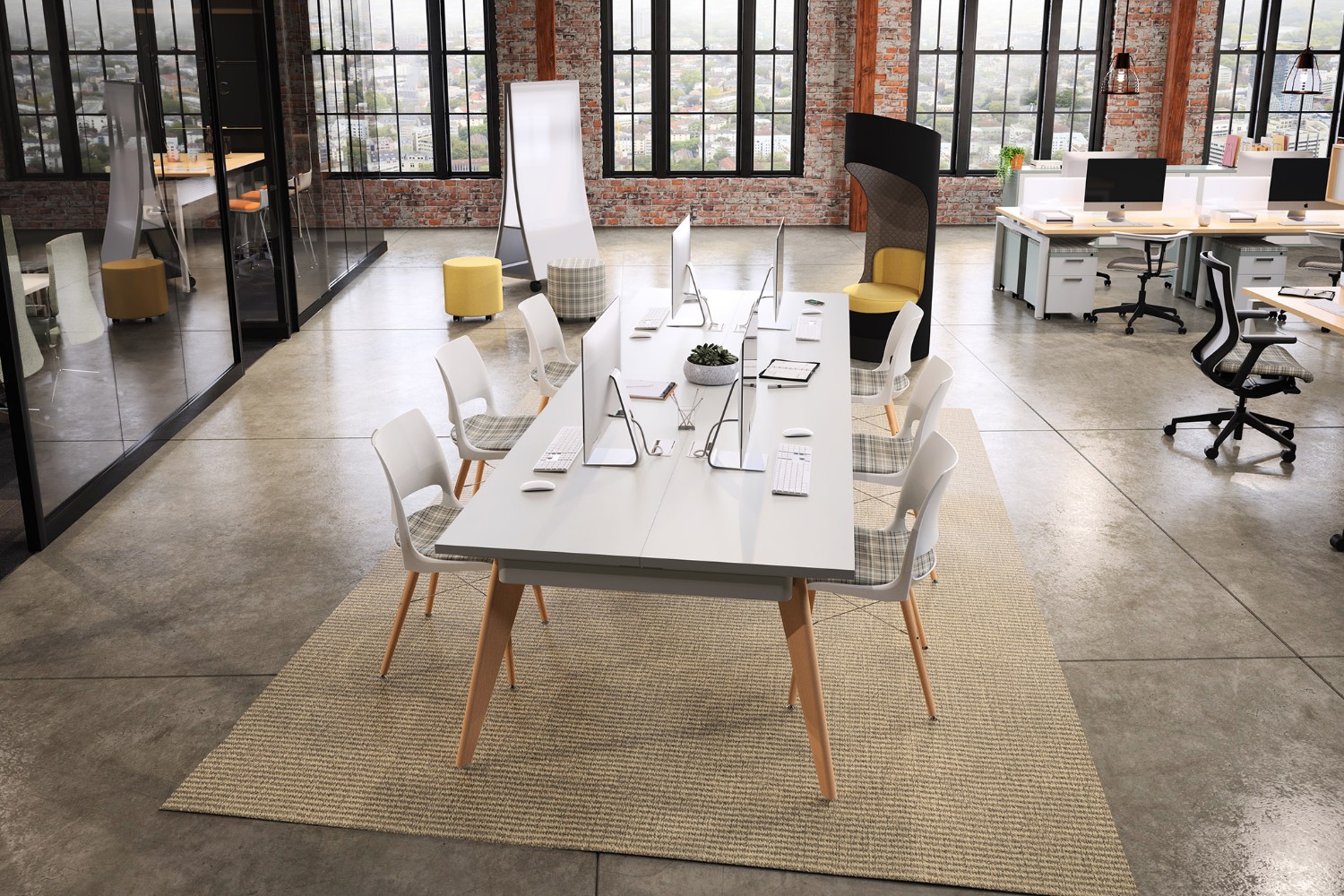 Metal-leg benching is either single- or dual-sided in 29-inch standard height or 42-inch café height. Café-height teaming tables with double modesty panels are also available. Wood-leg benching is dual-sided only and available in standard 29-inch height. Worksurfaces and frames are ordered separately. Optional privacy screens, dividers and modesty panels define personal space with a higher degree of privacy while maintaining an open, collaborative environment.