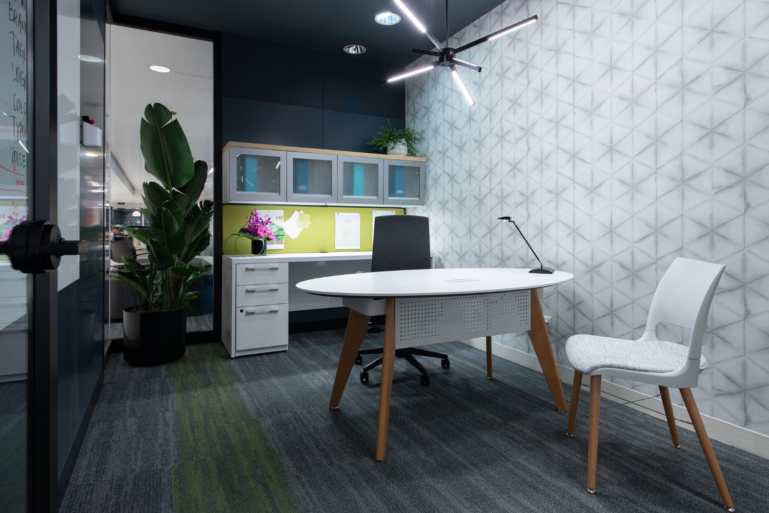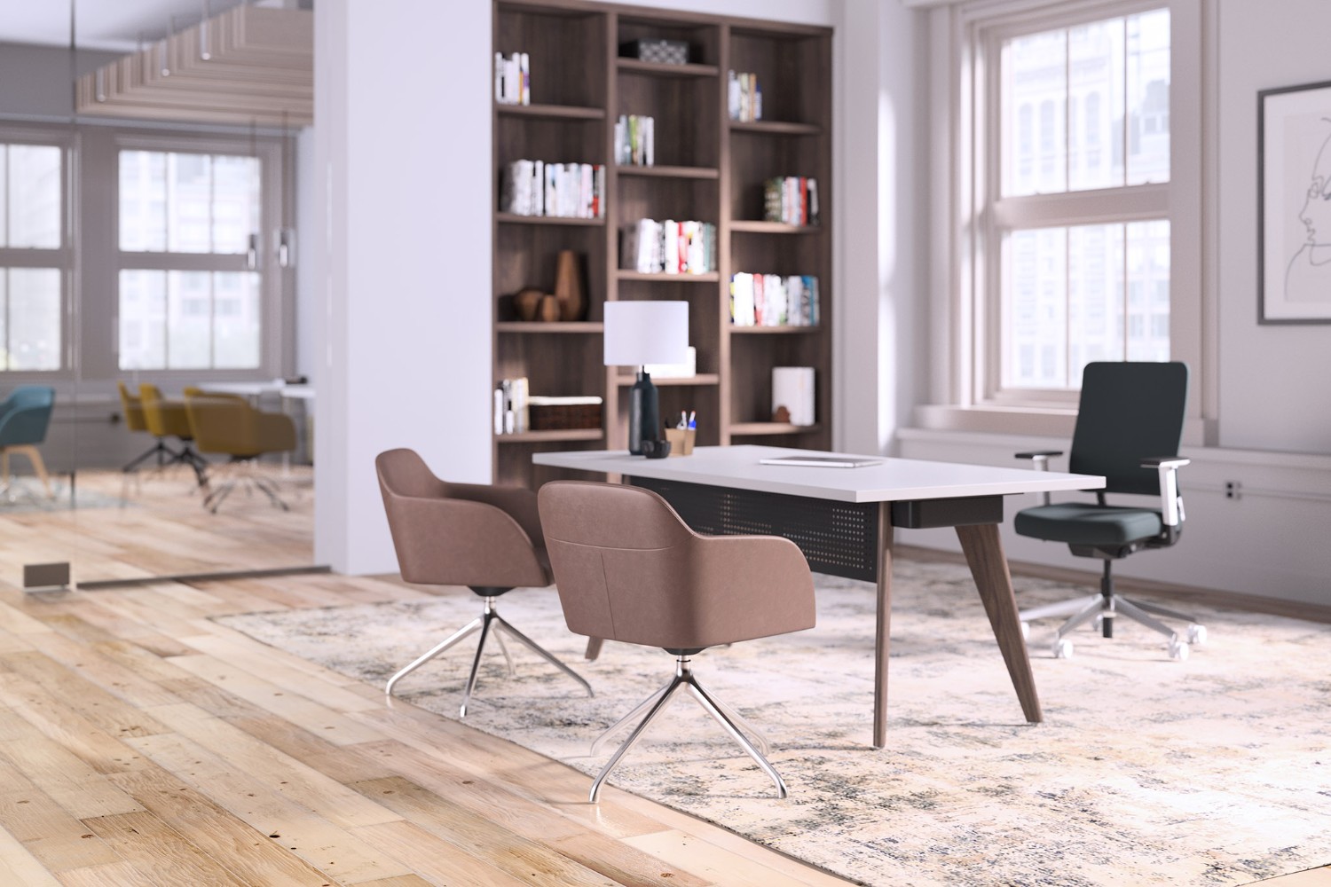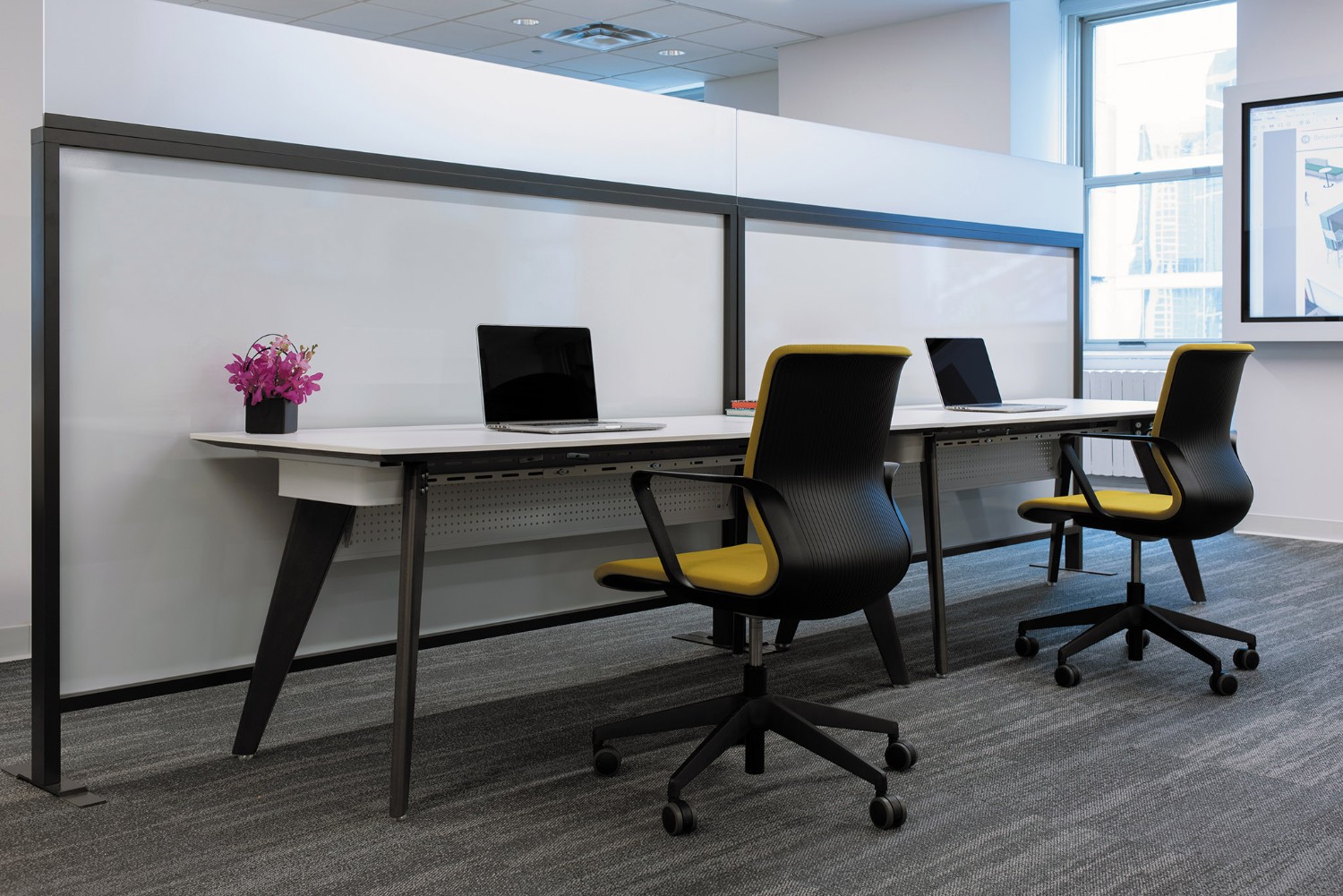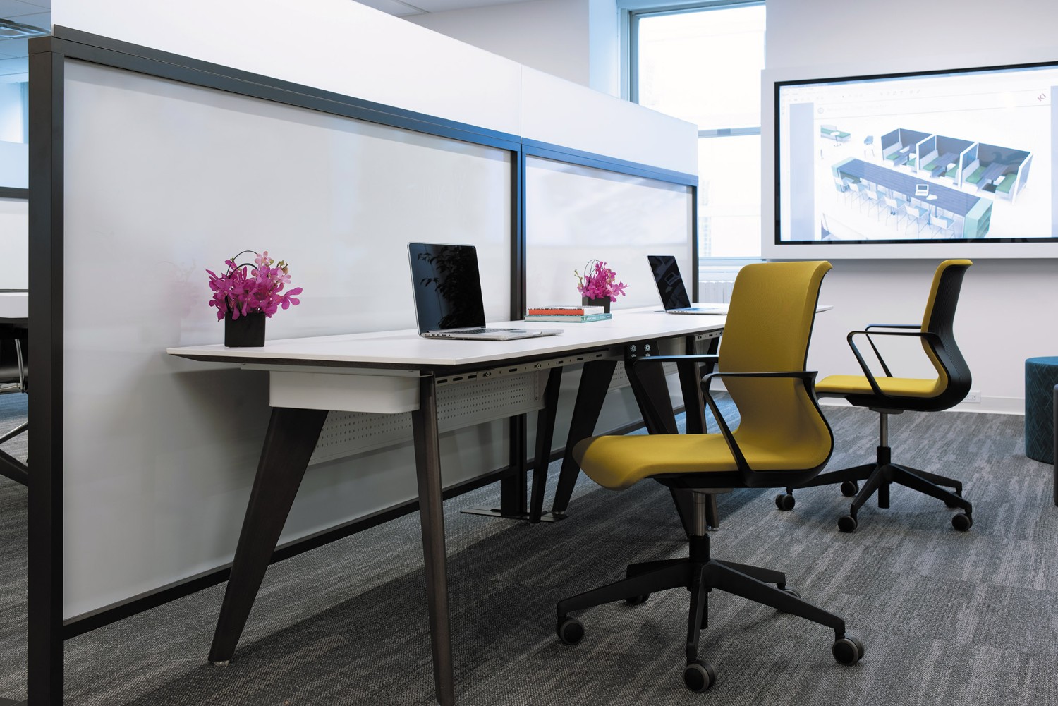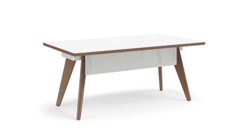 Desks with wood legs add elegance and warmth to office environments. With trends in biophilic design focusing on the instinctive bond between human beings and organic materials, the wood legs on Connection Zone desks offer a natural appeal and a more residential aesthetic. Desk legs are positioned near the outer edges to optimize undersurface space for individual users.