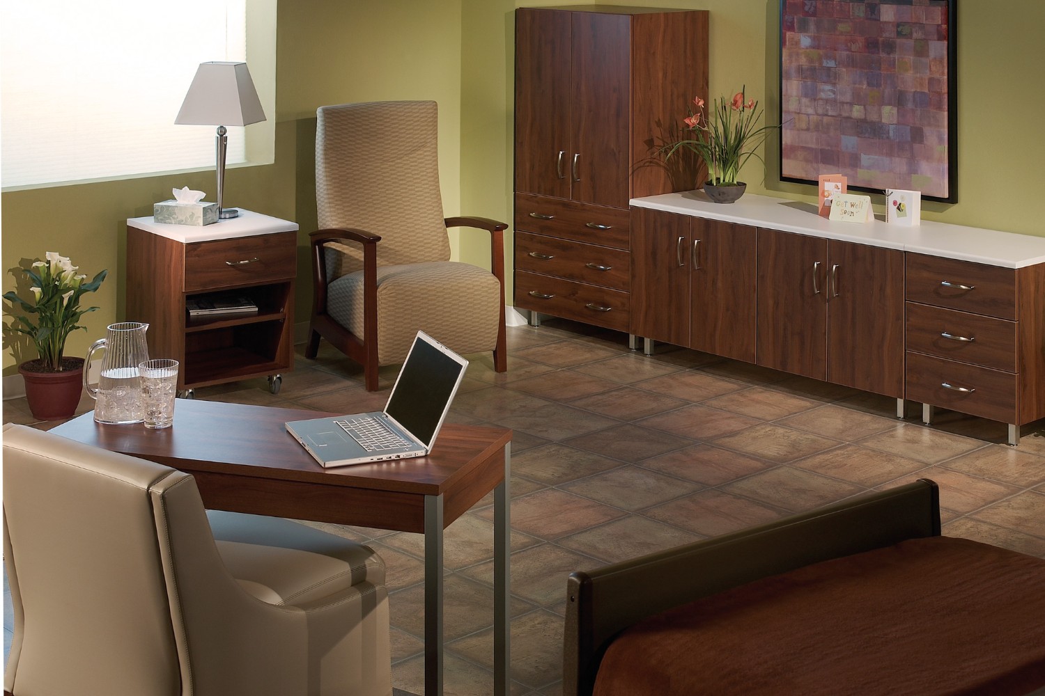 For patient rooms or residence quarters, Dante® laminate casegoods provide durable, attractive storage solutions at a comfortable price. A clean, transitional aesthetic complements most environments. Surface finish options include various laminates, solid surfaces and membrane press surfaces. There are four pull styles, four base options and six edge/surface options. The modular pieces of Dante casegoods include a bench, bedside cabinet, chest, dresser, armoire, wardrobe and mobile table. Shelves adjust in one-inch increments. Shelf and hanger rods are standard in wardrobes. Dante casegoods’ durable construction and lifetime warranty assures that it will withstand years of use. It passes BIFMA testing standards and its recycled content contributes to a greener world. Dante casegoods offer an upscale look at an affordable price. So, you can compose appealing healthcare, office or residence spaces and still stay within budget.
