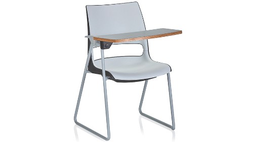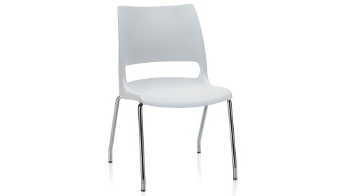 Dōni multi-purpose stack chairs include 4-leg, 4-leg wallsaver, 4-leg with casters, and sled base styles. All models stack 12-high on a dolly and 6-high on the floor. The Dōni ganging mechanism allows curved rows and rotates out of sight below the seat when not in use.