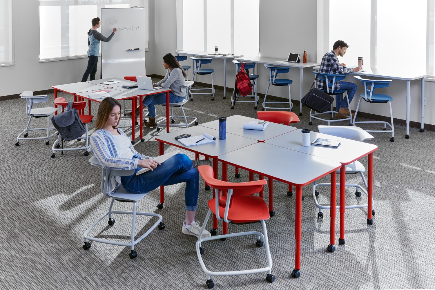 Configure Ruckus post-leg desks to bring people together for group work or re-configure them to accommodate focused and individual work. Easily move and arrange desks to support interactive learning and traditional learning space layouts. Five engaging desk shapes— OddQuad, E-Triangle, R-Triangle, Trapezoid, Rectangle—are available in a variety of dimensions.