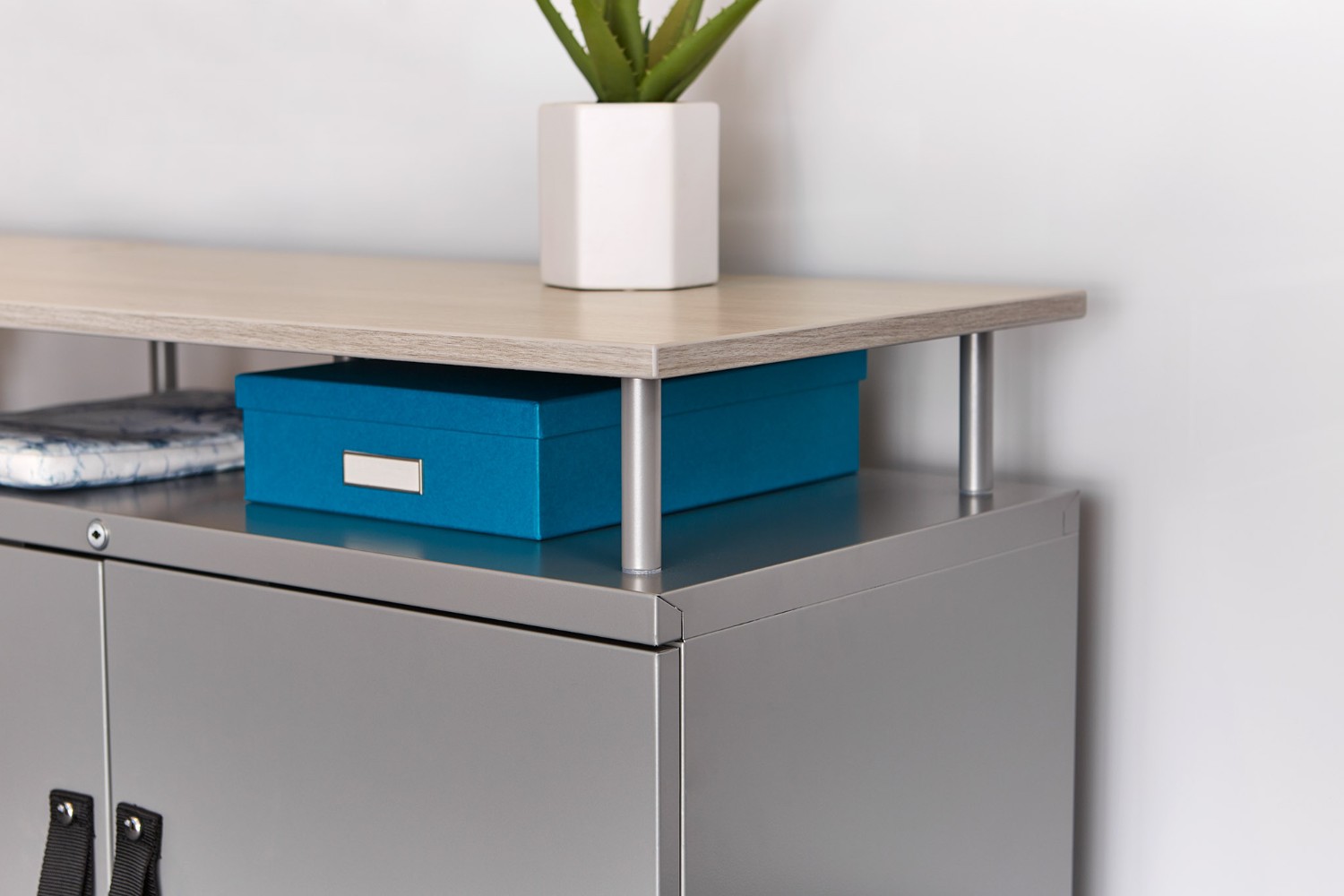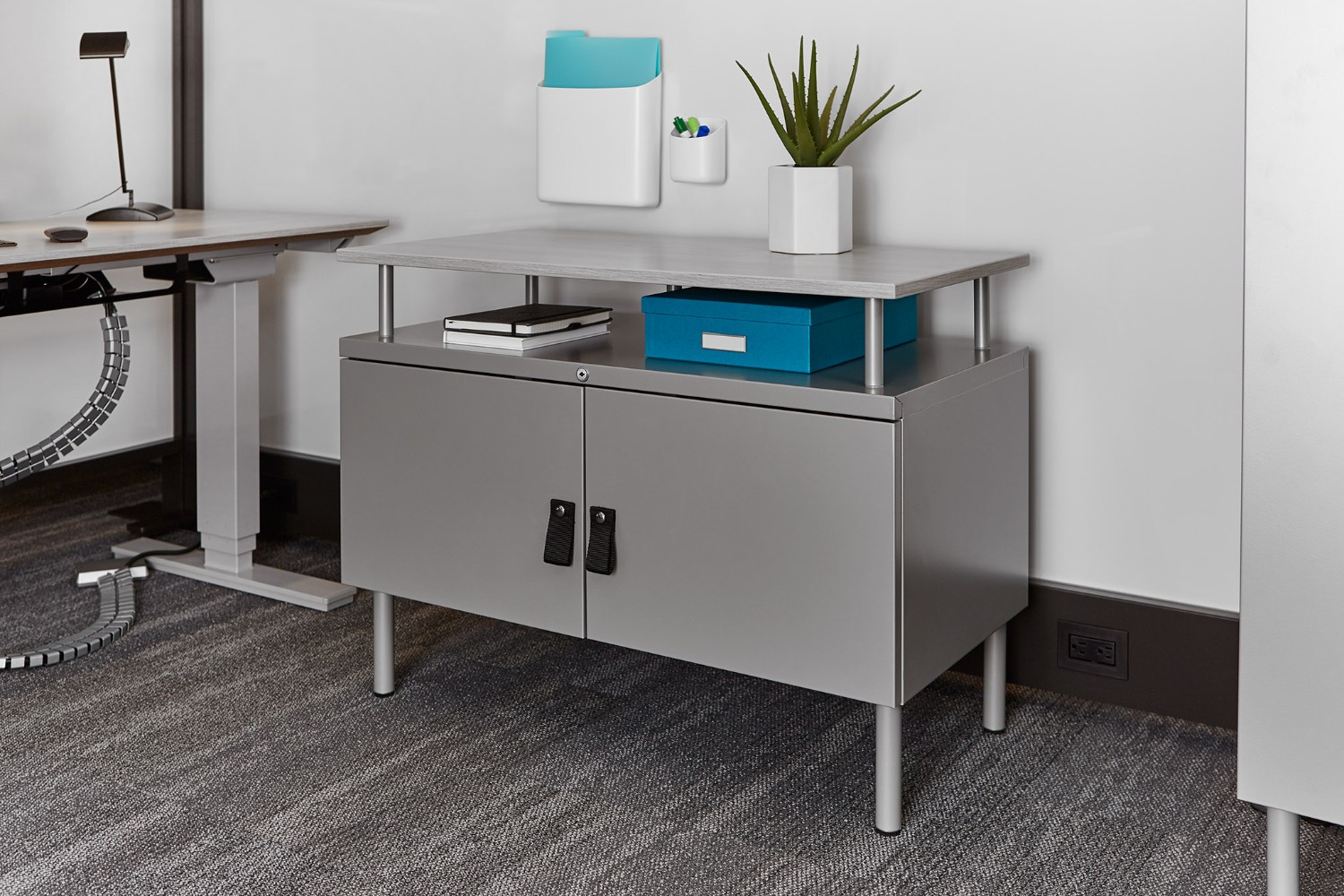 Tattoo storage provides a perfect balance of work and personal compartments for your purse, gym bag, a change of shoes, plus files and folders. It offers mobility and user-control that adapts to of-the-moment needs for privacy or interaction. Featuring an inset leg design, storage elements can be easily moved within your workspace.