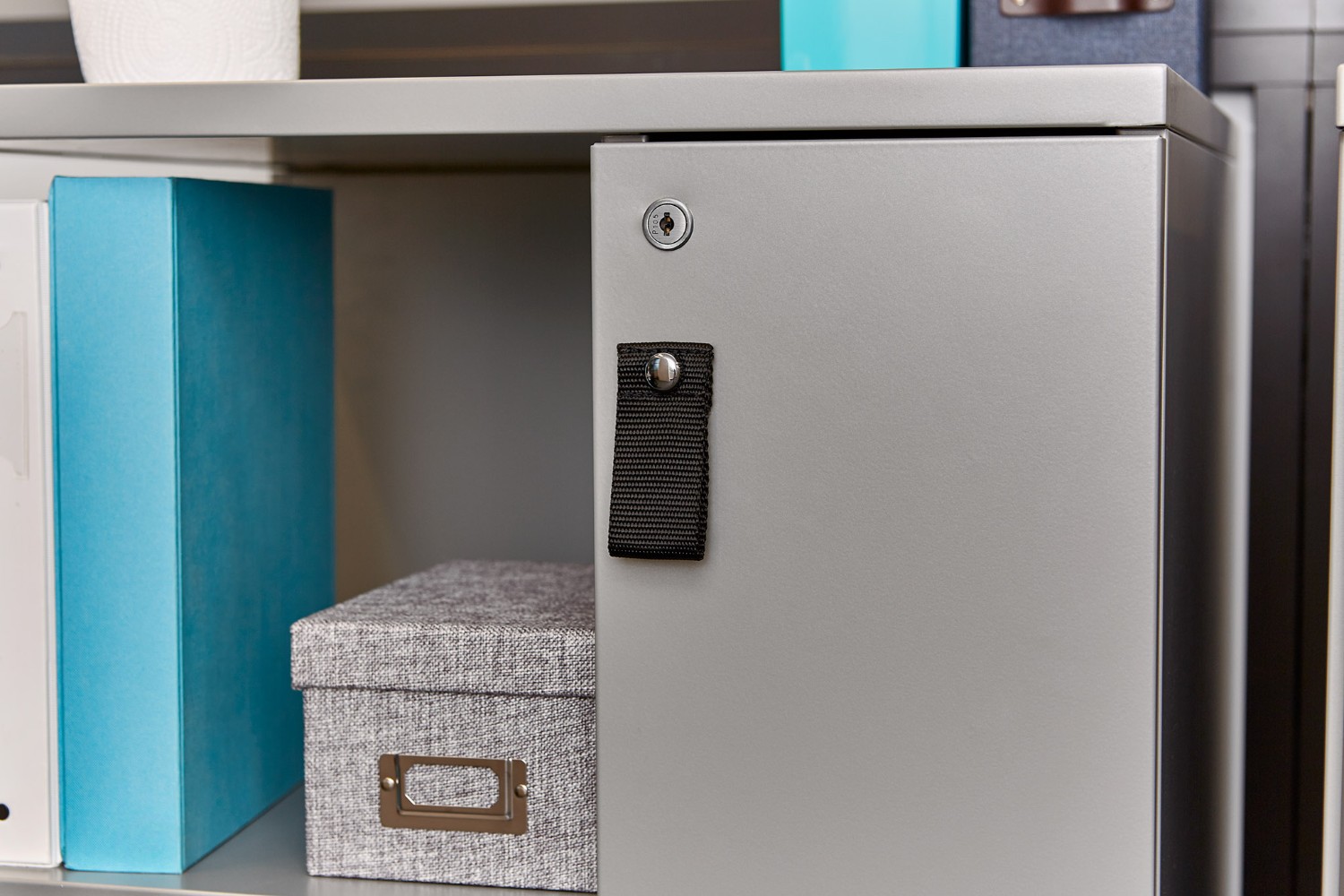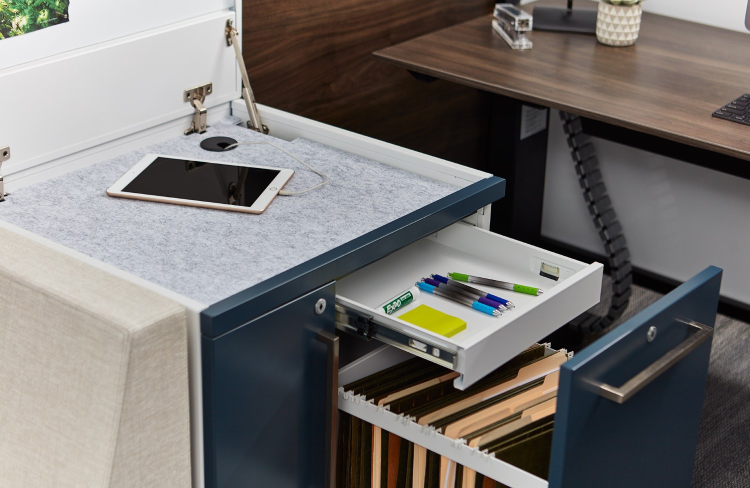 Tattoo storage provides a perfect balance of work and personal compartments for your purse, gym bag, a change of shoes, plus files and folders. It offers mobility and user-control that adapts to of-the-moment needs for privacy or interaction. Featuring an inset leg design, storage elements can be easily moved within your workspace.