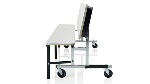 Food service areas often double as study halls, meeting rooms and more. You need a bench with back support… a bench with worksurface… a cafeteria table… Uniframe convertible bench does it all for one low cost. It’s easy to operate. From the folded position, simply pull down the bench seat and pull up the worksurface. Or, combine two units to create a high-quality cafeteria table. The ganging mechanism is located at the top of the frame base for easy operation and exceptional reliability. To return the bench to its folded position, lift up on the worksurface to release the gravity lock and fold down. Nest folded benches for compact storage. This cafeteria table option is available with a 27″ or 29″ high worksurface and 8′ length. A variety of laminates are available to support school colors and edges are finished with either 73P PVC edge or a durable vinyl bullnose. Support frames available in black or chrome. Uniframe convertible benches ship partially assembled. Final assembly on site can typically be done in 10 minutes without special tools.